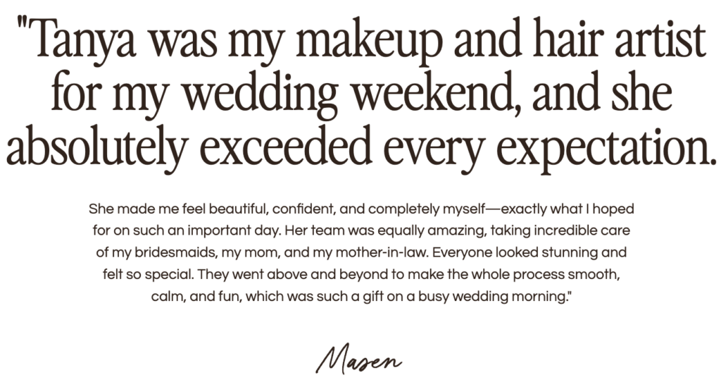 For brides who want the highest level of care, many choose to hire Tanya for a full-day rate, which allows her to stay on-site and support you from start to finish.